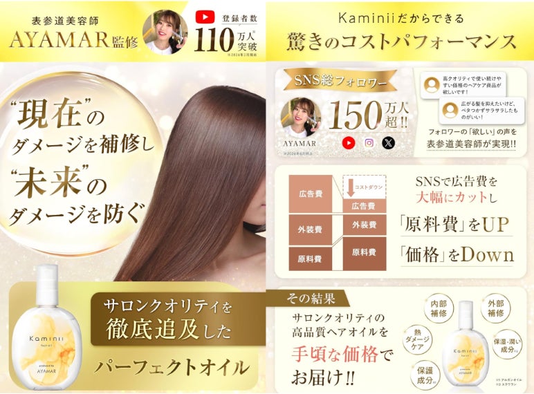 KaminiiはAYAMARの日々のヘアケアの研究、150万人を超えるSNSフォロワーの声から誕生したブランドです。第一弾として、【ドライヤー前に特化した洗い流さないトリートメント(ヘアミルク)】、第二弾として【ツヤがあるのにベタつかない新感覚のヘアバーム】を発売。Amazon各部門でランキング1位を獲得し、発売開始から2度の完売という大きな反響を頂いております。
