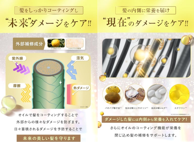 今回発売したのは、その第三弾商品となる【“現在”のダメージを補修し、“未来”のダメージを防ぐヘアオイル】です。こちらも発売から大変好評をいただいており、Amazon各部門でランキング1位を獲得し、7冠を達成しております。