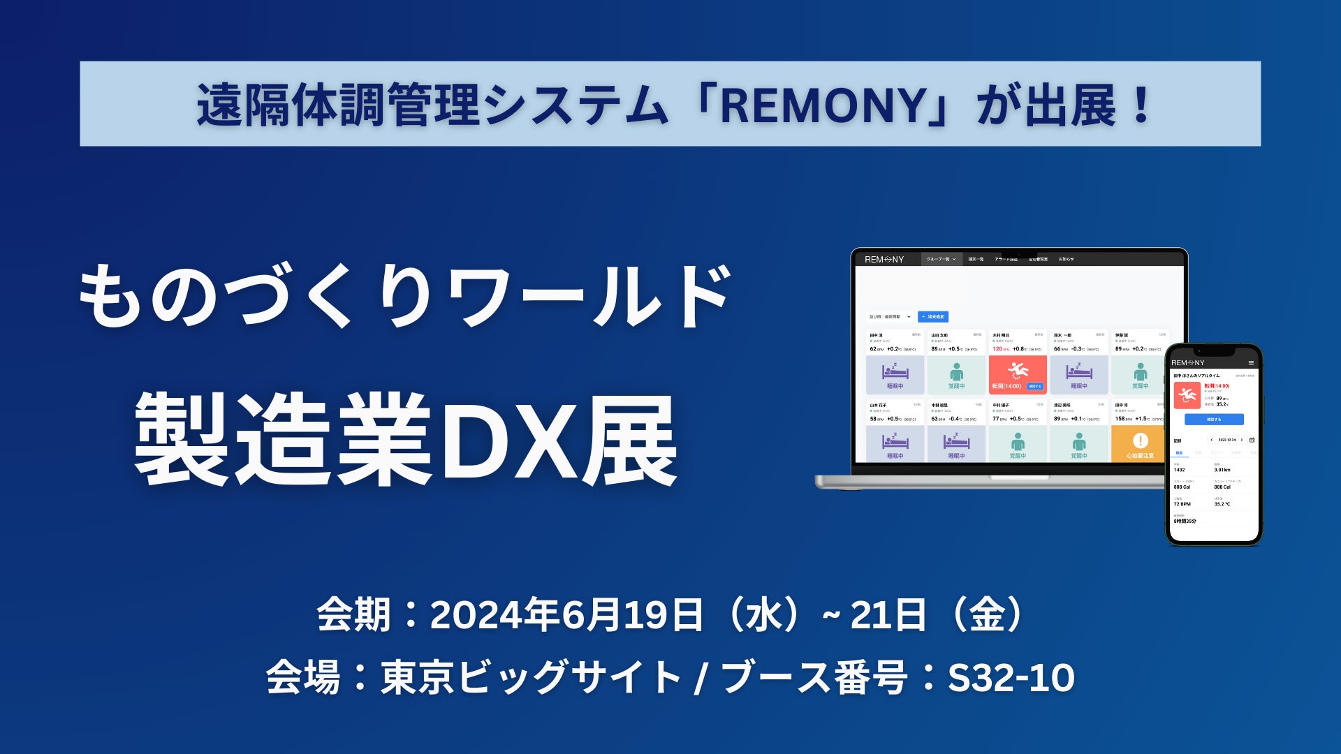 本展示会は、国内外の製造業の設計、開発、製造、生産技術、購買、情報システム部門の方々と活発に商談が行われる展示会です。この展示会ではマザーラボの遠隔体調管理システム「REMONY」を紹介します。「REMONY」は、24時間充電不要のスマートトラッカー「MOTHER Bracelet®」を活用した従業員や利用者の健康状態を見守ることができるシステムです。