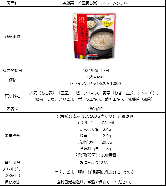 今回、【からだキレイ化計画】をコンセプトとした「美穀菜」より、ダイエット中でも必要な栄養を摂り、おいしく食事を楽しみたい方に向け、「世界のお粥」シリーズ第2弾として『美穀菜 韓国風お粥 ソルロンタン味』を新発売いたします。