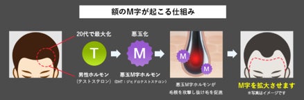 額のM字型脱毛症の主な原因は、体内の悪玉M字男性ホルモン「ジヒドロテストステロン(DHT)」によるものとされています。DHTは、20代で最大化する男性ホルモン(テストステロン)が第二次性徴の終了から悪玉化することで生成されます。この悪玉M字ホルモンが毛根を攻撃し、M字型の脱毛を引き起こします。