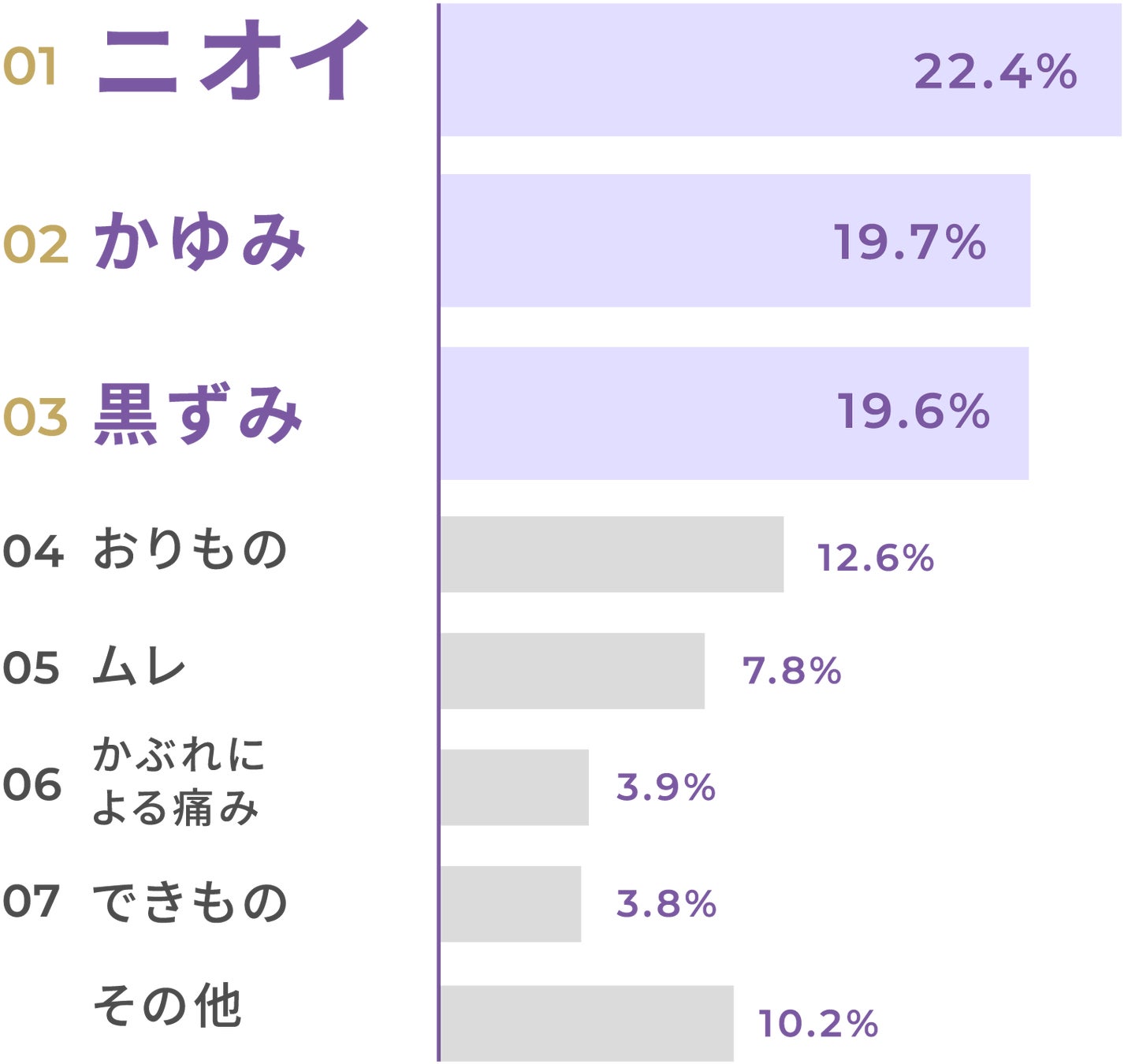 特に上位のお悩みとしては、ニオイ、乾燥によるかゆみ、黒ずみ※などが挙げられます。