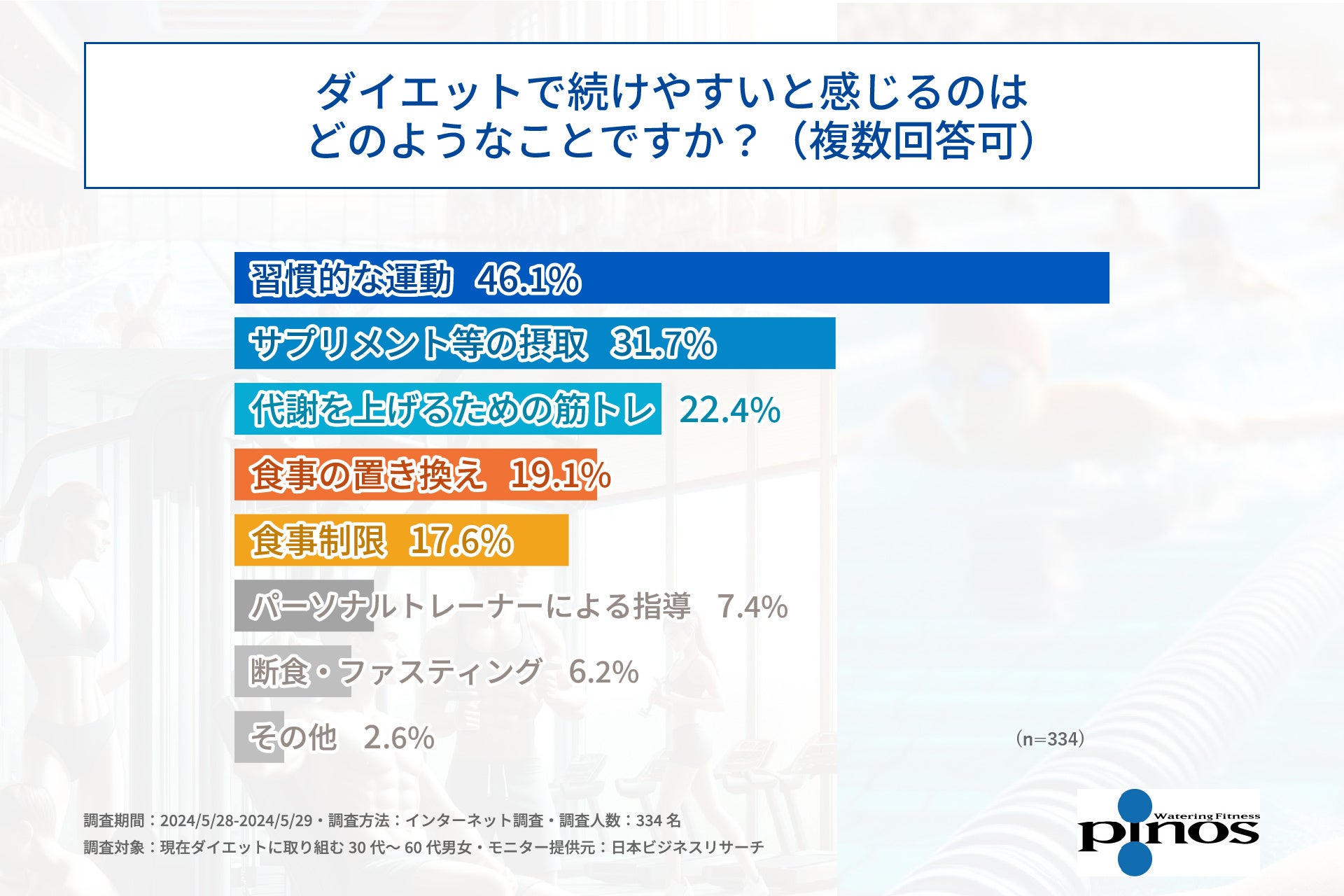 調査の最後、「ダイエットで続けやすいと感じるのはどのようなことか」という設問の回答では、1位「習慣的な運動(46.1%)」、2位「サプリメント等の摂取(31.7%)」となりました。前項の調査結果からもダイエットで「食事」に関わる部分の取り組みは困難さを感じる方が多いものの、「運動」については続けやすいと感じている方が多いとわかりました。