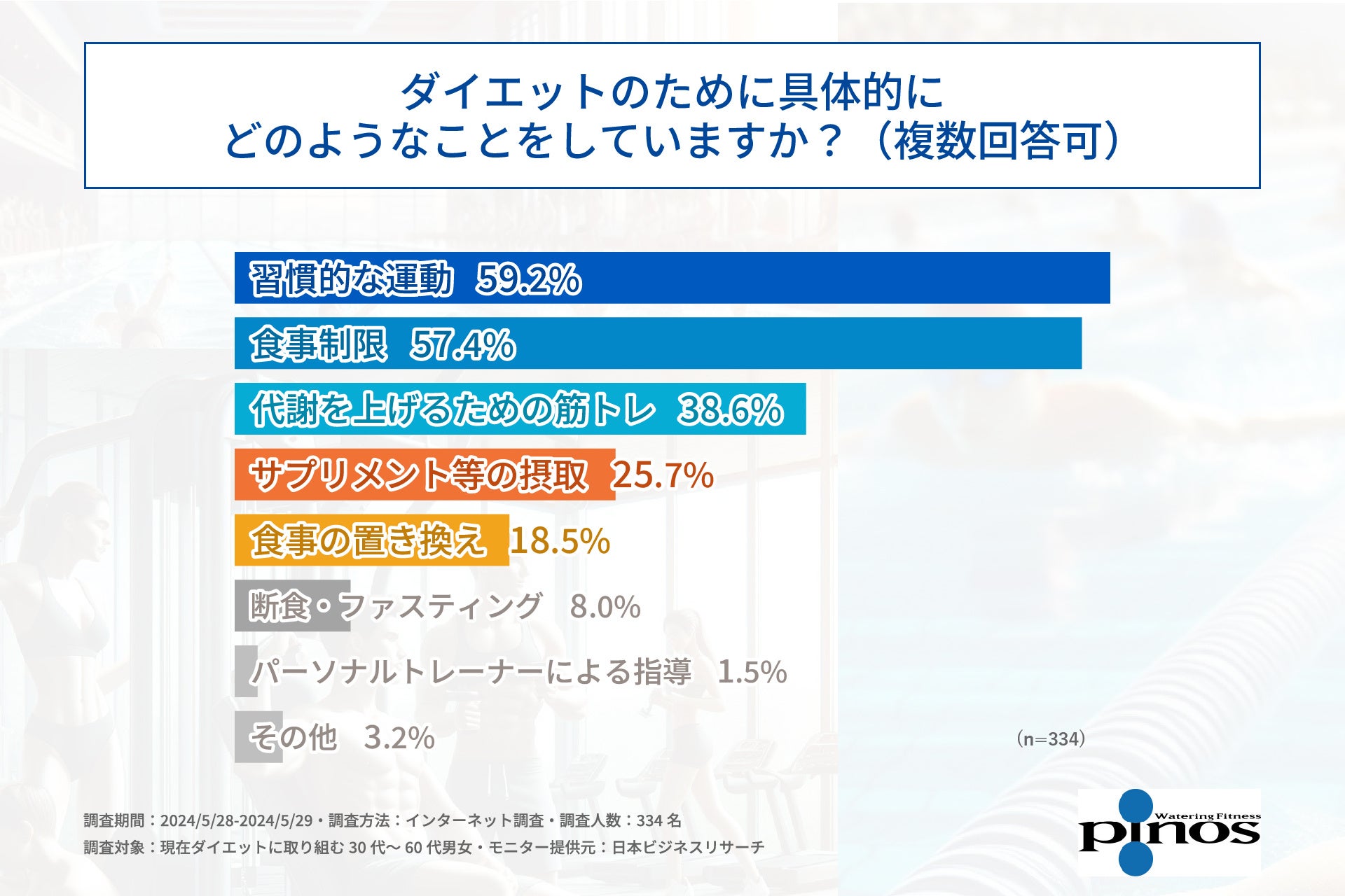 次に「ダイエットのために具体的にどのようなことをしているか」を尋ねる設問の回答で多かったのは1位「習慣的な運動」で59.2%、続いて2位「食事制限」で57.4%となりました。この2つの回答のみ回答率50%を上回り、「習慣的な運動」と「食事制限」がダイエットのための主な取り組みとなっている実情がわかりました。