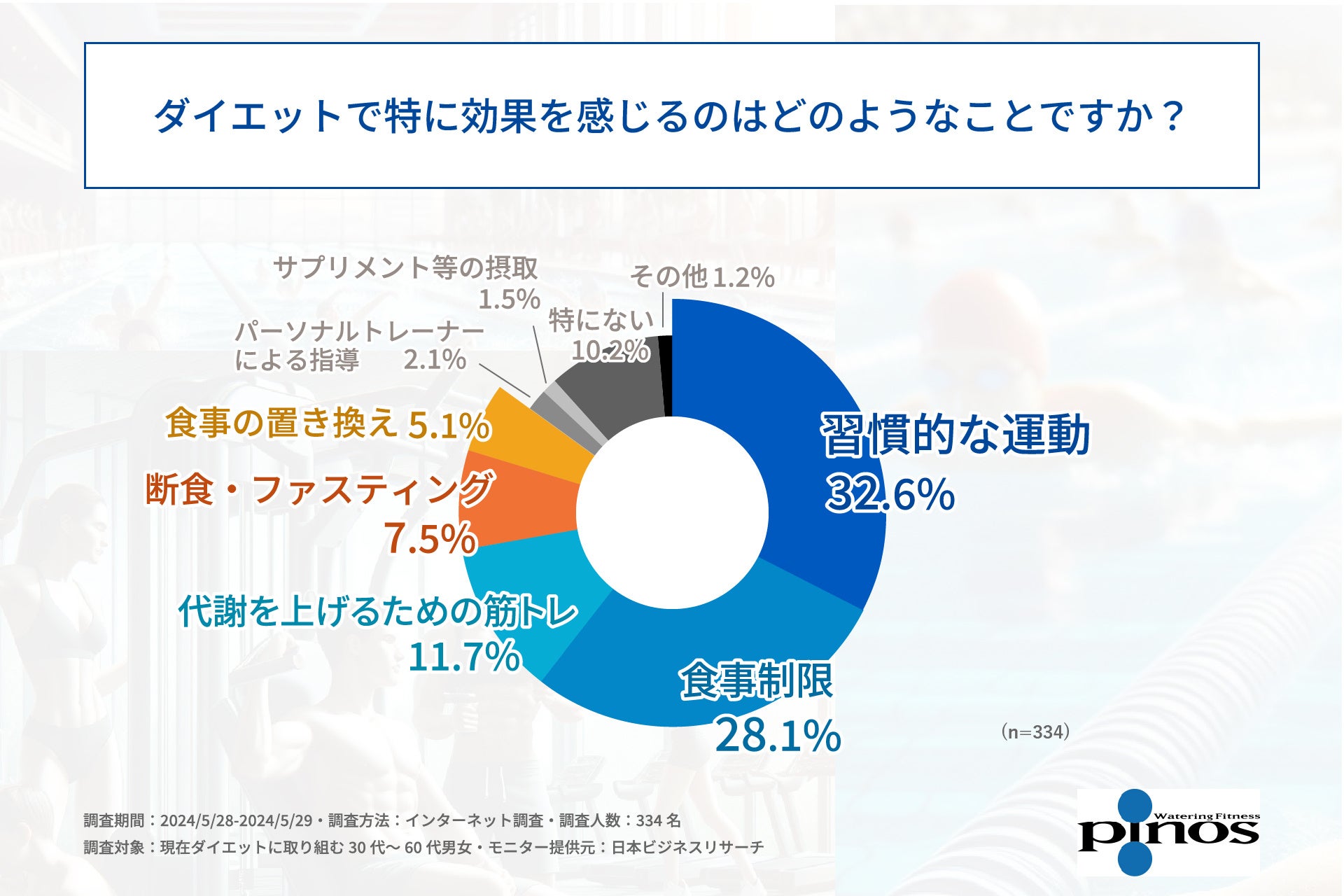 次に「ダイエットで特に効果を感じること」を回答してもらう設問では、前項同様、最も多かった回答が「習慣的な運動」で32.6%、次いで多かった回答が「食事制限」で28.1%となりました。この調査結果から、この2つの取り組みに特にダイエットの効果を感じられている方が多いとわかりました。