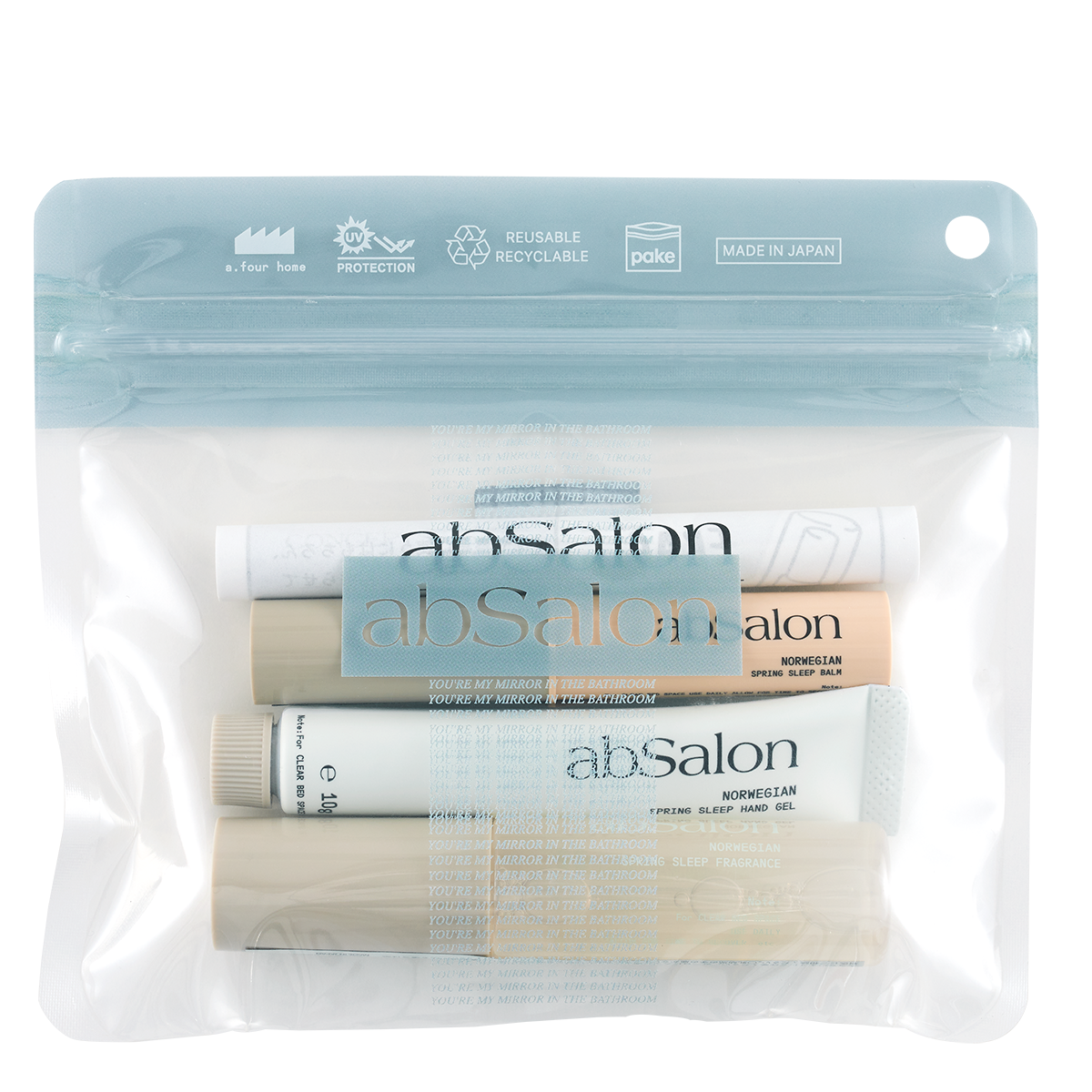 『abSalon』は香りのちからで心地よい睡眠時間へ誘うために生まれたブランド。「abSampo kit」は、フレグランススプレー、ハンドジェル、スティックバームの3点セットで、外出先でも持ち運びやすいジッパーバッグ入りです。フレグランススプレーは、お休み前はもちろん、観光中や食事のあとの洋服、マスクなどにスプレーをして爽やかな香りを纏うことができ、ハンドジェルはアルコール60vol%配合、スティックバームは濃厚な使い心地となっています。パッケージは、使い終えた後もリユーザブルできるジッパーバッグプランドPake®の限定パッケージです。
