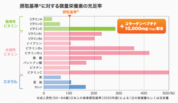 ※4 日本褥瘡学会「褥瘡予防・管理ガイドライン 第5版」 総論 栄養の項目「褥瘡患者に対する特定の栄養素の補給」にて、「亜鉛、アスコルビン酸、アルギニン、L-カルノシン、n-3系脂肪酸、コラーゲン加水分解物、β-ヒドロキシβ-メチル酪酸、α-ケトグルタル酸オルニチンなど疾患を考慮した上で補給してもよい。」と記載されています。「ブイ・クレスCP10(シーピーテン)ミックスフルーツ」には、コラーゲンペプチド(コラーゲン加水分解物)、亜鉛、ビタミンC(アスコルビン酸)が配合されています。申請により、それらが関与成分として許可されました。