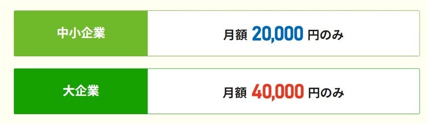 料金は、初期費用0円、中小企業様は月額20,000円のみ、大企業様は月額40,000円のみと、従業員1人当たりの料金が発生しないため、とても格安にご利用いただけます。