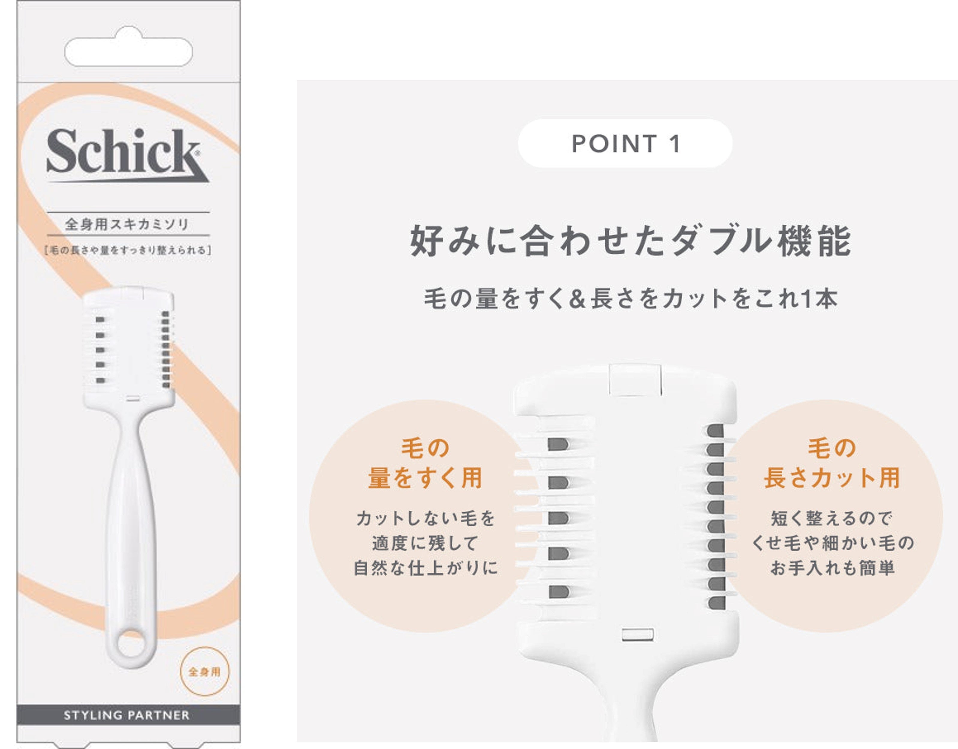 毛を梳いて適度に残して自然な仕上がりにできる「梳く用カミソリ」と、毛の長さをカットする「カット用カミソリ」の2in1機能で好みの量と長さに整えられます。刃が直接肌にあたりにくい安全設計で肌にやさしく簡単に毛を整えることができ、チタンコートの刃で切れ味長持ち。