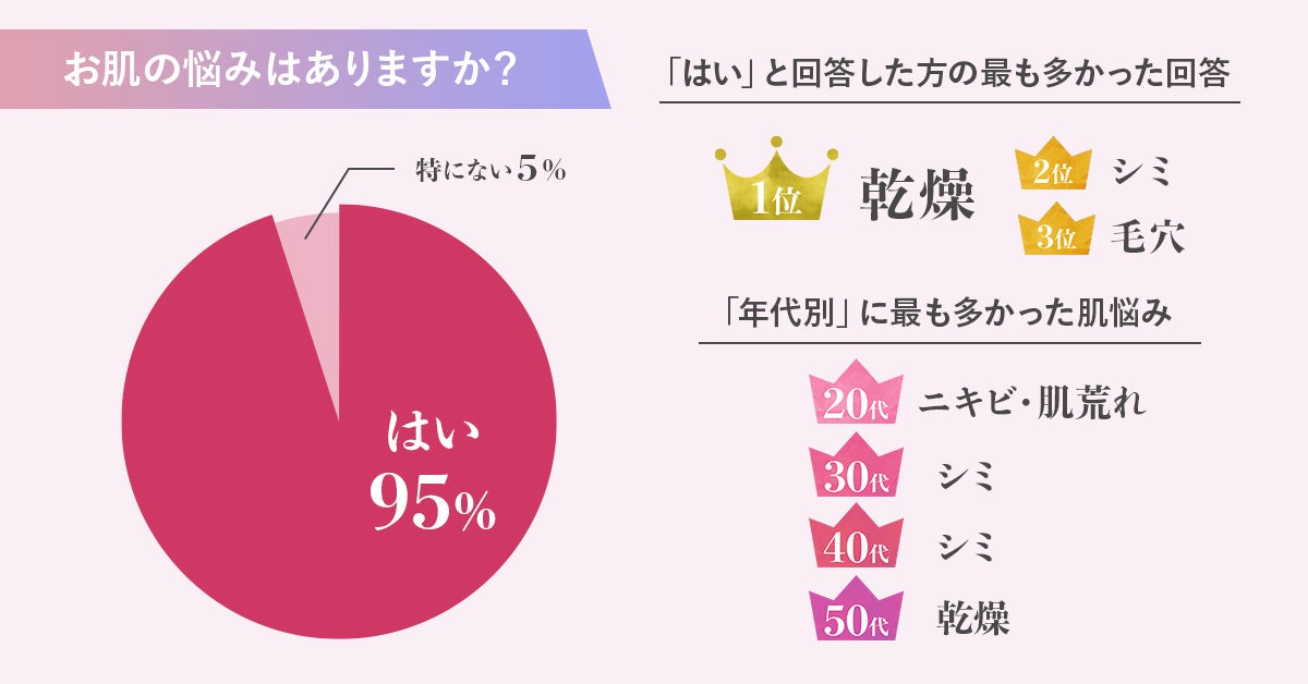 アンケート回答者に、お肌の悩みを抱えているかどうかを伺ったところ、全体の95%が「はい」と回答しました。お肌の悩みの中でも、特に多かったのは下記の回答です。