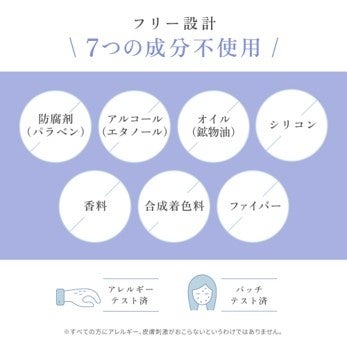 オイルやアルコールなど7つの成分を不使用としたフリー設計※4にこだわっています。また、アレルギーテスト・パッチテストの2つの肌テストを実施済みです。