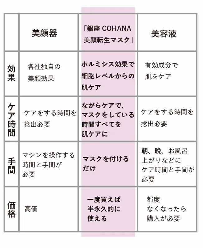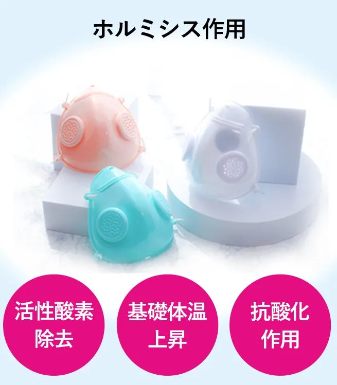 美顔転生マスクは、ホルミシス効果による細胞レベルからの肌ケア作用と、ながらケアで簡単に使える半永久的な便利さを兼ね備えた、画期的な美容マスクです。