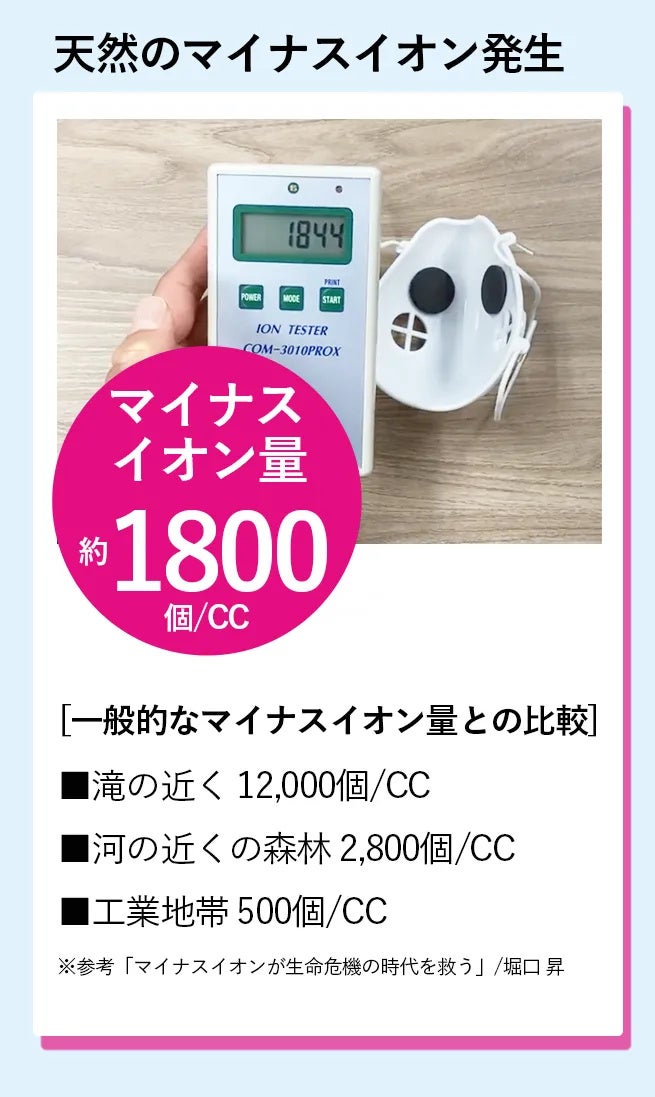 美顔転生マスクが備えるラジウム鉱石は、天然のマイナスイオンを発生させています。