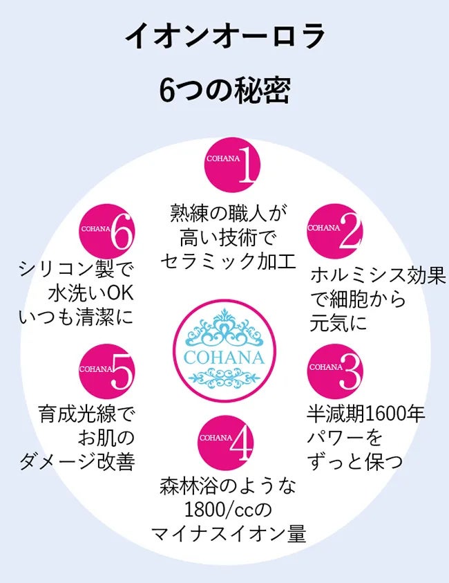マイナスイオンは、空気中のプラスイオンを中和し、肌荒れやニキビの原因となる活性酸素を除去する効果があります。また、血行を促進し、新陳代謝を活性化することで、ハリ・ツヤのある透明感のある美肌へと導きます。