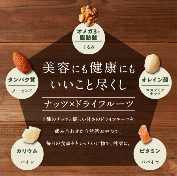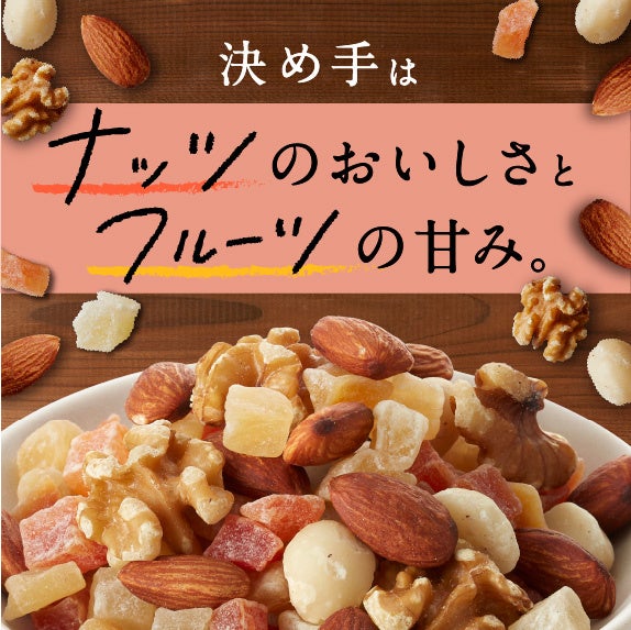 こだわりは、ナッツのおいしさとフルーツの甘みの絶妙なバランスです。「フルーツの甘味があって美味しい!」と嬉しい評判を沢山いただいています。さらに、食物繊維が豊富で、美容にも健康にも良いタンパク質やオメガ脂肪酸、ビタミン類、カリウムなどもちゃんと摂れます。もちろん無塩です。