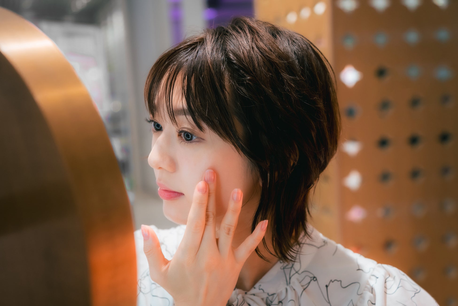 リップ&チークの上級テクニックを教えてくれました。「頬のまん中に丸く入れて、鼻の上、あご先、耳にもプラスしました。血色のいい立体感を作ってくれます。リップは最初は唇のまん中に置いて、指でなじませています。ツヤツヤでぷるんとした質感がハマりそうです」