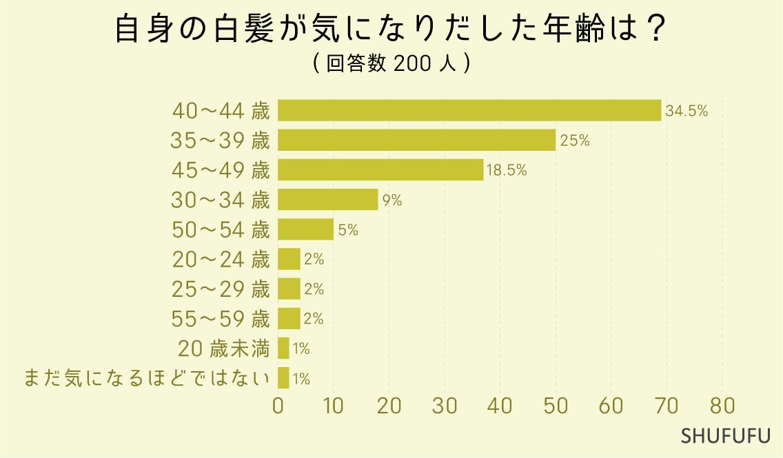 自身の白髪が気になりだした年齢は?の問いに対して最も多かったのが「40〜44歳(34.5%)」でした。 次いで「35〜39歳(25%)」「45〜49歳(18.5%)」という結果でした。30代半ば〜40代前半にかけて気になり始めた人が約60%という結果となりました。