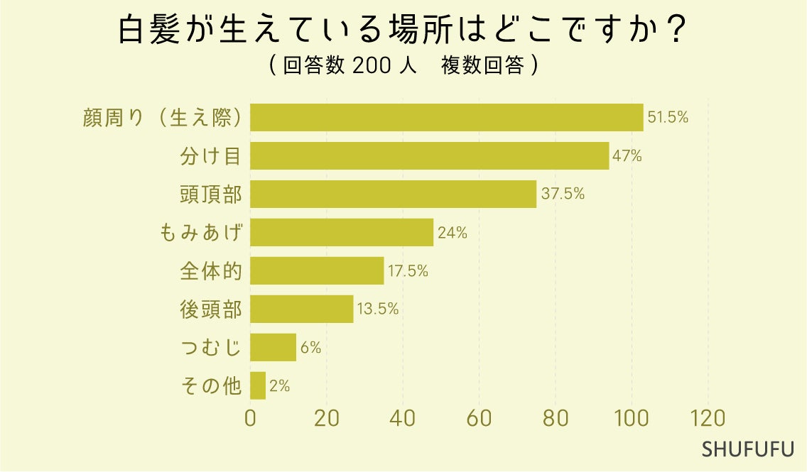白髪が生えている場所に関しては1位「顔周り(生え際)(51.5%)」、2位「分け目(47%)」でした。顔の周りの生え際や分け目は、特に目立つ部分なので気になりますね。
