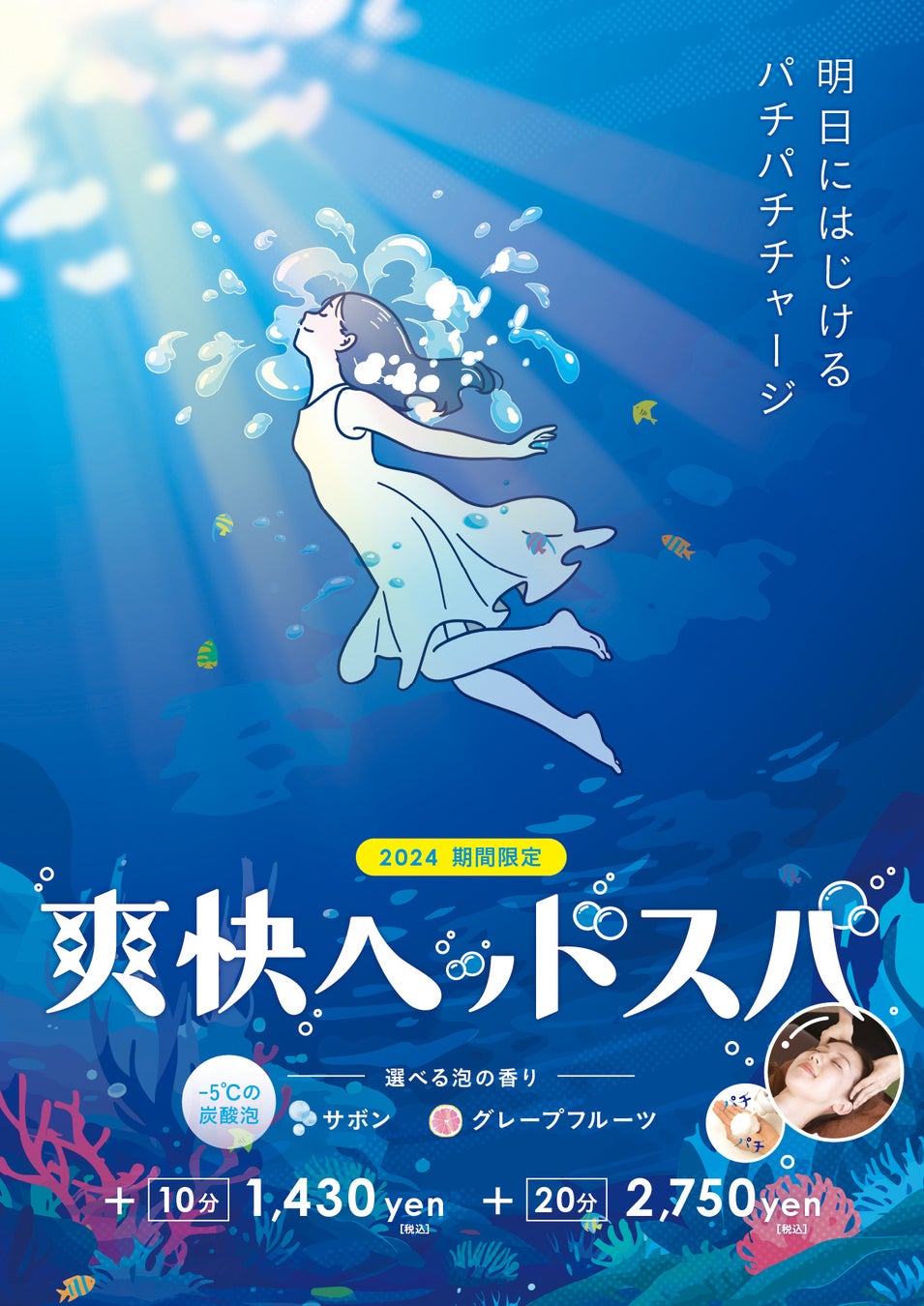 今年は、優しいサボンの香りとさわやかなグレープフルーツの香りの2種類をご用意しております。パチパチと弾ける炭酸泡の『音』『感覚』『香り』で、夏の暑さによって疲れた身体と心をスッキリと癒します。