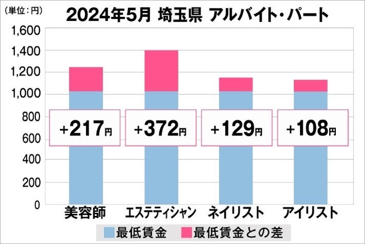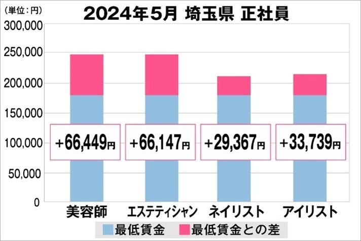 2024年5月時点で『美プロ』に掲載されている「埼玉県」の「美容師・エステティシャン・ネイリスト・アイリスト」求人における「正社員」「アルバイト・パート」の給料を抽出。