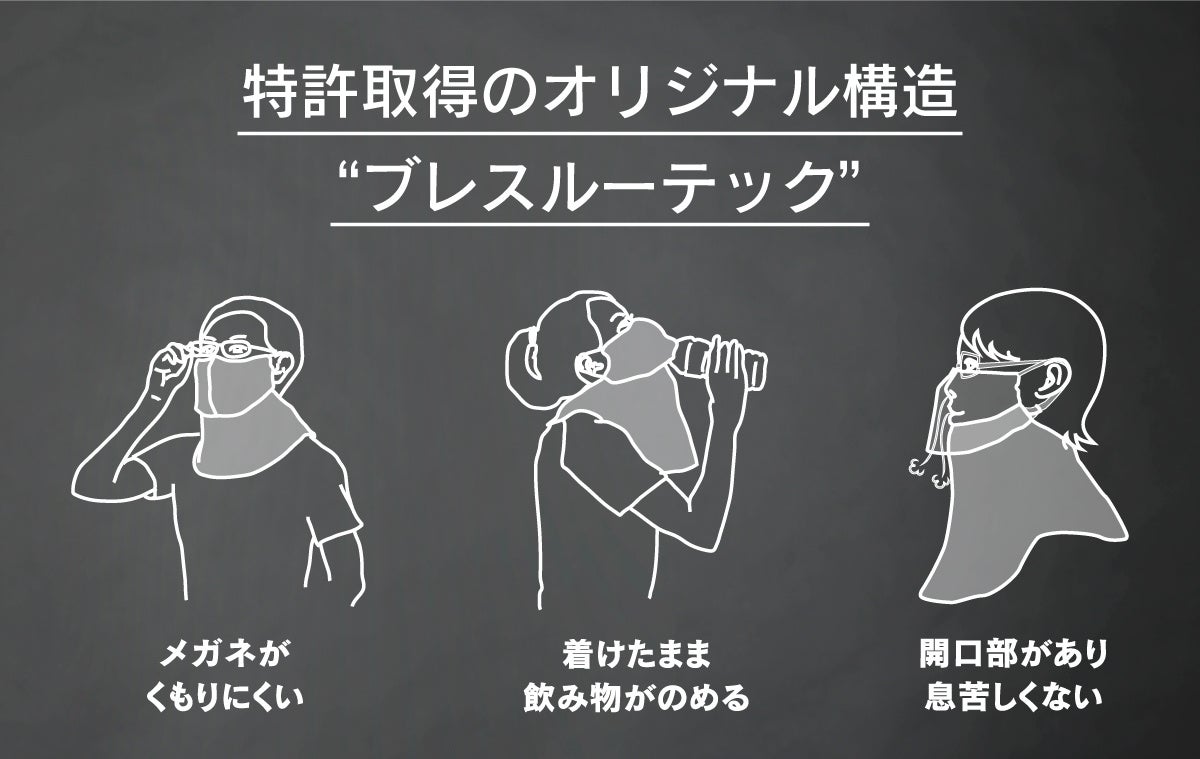 ゆったりとした開口部を設け、吐いた息が下に抜けるよう設計され、水分補給やメガネの曇り防止にも役立ちます。