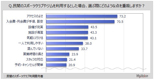 民間のスポーツクラブ利用意向者が、スポーツクラブを選ぶ際の重視点は(複数回答)、「アクセスのよさ」「入会費・月会費が手頃、割安」が各7割強、「設備が充実」「施設が清潔」「気軽に行ける」が各4割強、「一人で利用しやすい」「混んでいない」が各30%台です。