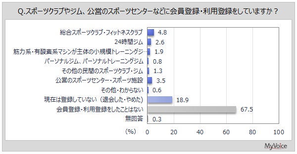 登録している施設は(複数回答)、「総合スポーツクラブ・フィットネスクラブ」が4.8%、「24時間ジム」が2.6%です。「公営のスポーツセンター・スポーツ施設」は3.5%となっています。