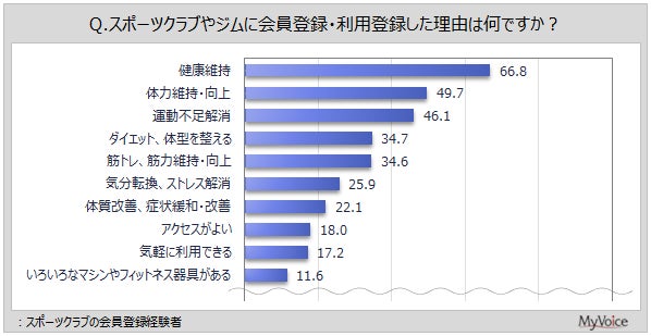 スポーツクラブの会員登録経験者に、登録した理由を聞いたところ(複数回答)、「健康維持」が66.8%、「体力維持・向上」「運動不足解消」が各5割弱、「ダイエット、体型を整える」「筋トレ、筋力維持・向上」がそれぞれ約35%です。
