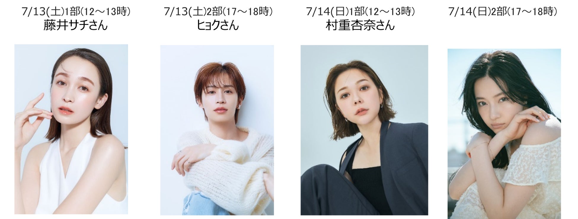 また、会場内の特設LIVE Studioから1日2回、計4回ライブ配信するLive Shoppingでは、初日の第1回目のゲストに藤井サチさんが登場し、バイオコスメブランドNEOGENのアイテムをご紹介します。第2回目はヒョクさんによるAnua・Veganifect・ALLUDEM・make p:remの4ブランドのアイテム紹介、第3回目は村重杏奈さんがローズセラムなどが人気のISOIのアイテムを紹介、ラストの4回目は村瀬紗英さんが、6月メガ割ランキングで美肌チャレンジセットが3位となったブランドのAnuaをご紹介します。