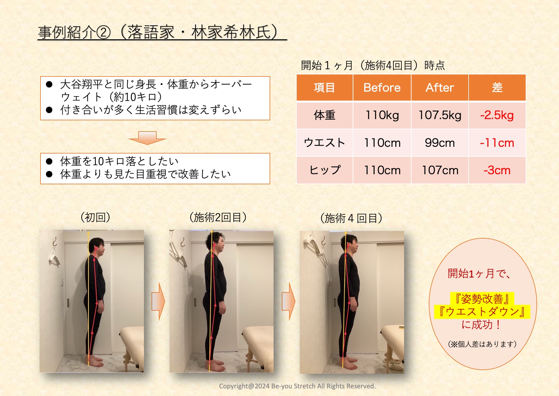 金谷有希子氏と同様、姿勢改善によるウエストダウンは11cm、わずか数回の施術で見た目にも分かる大きく変化が現れました。体重は2.5キロ減となっており、順調なペースで進んでいます。