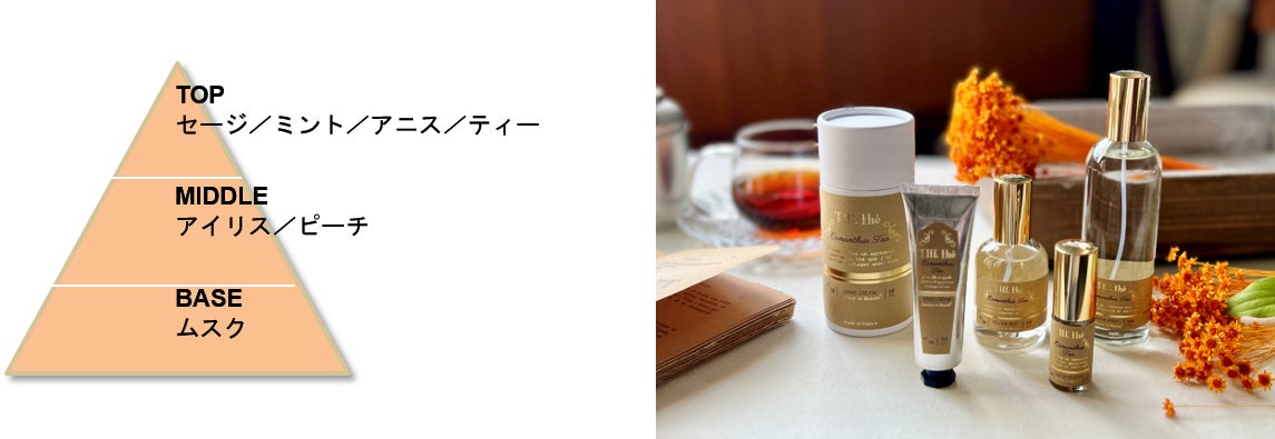 夏の終わりごろにふわりと香る「キンモクセイ」、学名「オスマンサス」の花。キンモクセイの花びらが浮かぶ淹れたてのハーブティーをイメージした「オスマンサスティーシリーズ」が今年も登場します。フルーティーですっきり爽やかな香りから始まり、思わず深呼吸をしたくなるような柔らかく甘みのある香りを経て、ウッディなどこか懐かしく優しい香りへと続く、毎年夏から秋にかけて人気のシリーズ。ふんわり身に纏う「プティトワレ」、夏バテ肌もしっとり保湿する「ハンドクリーム」、心地良いおうち時間を演出する「ルームスプレー」、秋の夜長に心地良い眠りに誘う「ピローミスト」がラインナップ。毎日の生活にキンモクセイの香りを取り入れて、一足早い秋の訪れを感じてみませんか?
