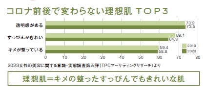 コロナ禍をきっかけに在宅勤務やオンライン会議が発達しましたが、「すっぴんでもキレイ」「キメの整った光拡散が均一な肌」を理想とする意見はコロナ前後でほぼ変わりませんでした。そんな30代~40代に向けて、ジュリーク農園のパワフルな植物やハーブの持つ自然の力がお役に立てるのではないか、という考えから開発がスタート。肌のキメに欠かせない、ジュリーク独自ブレンド*1「D-BLEND」を開発しました。(2019年と2023年の比較)