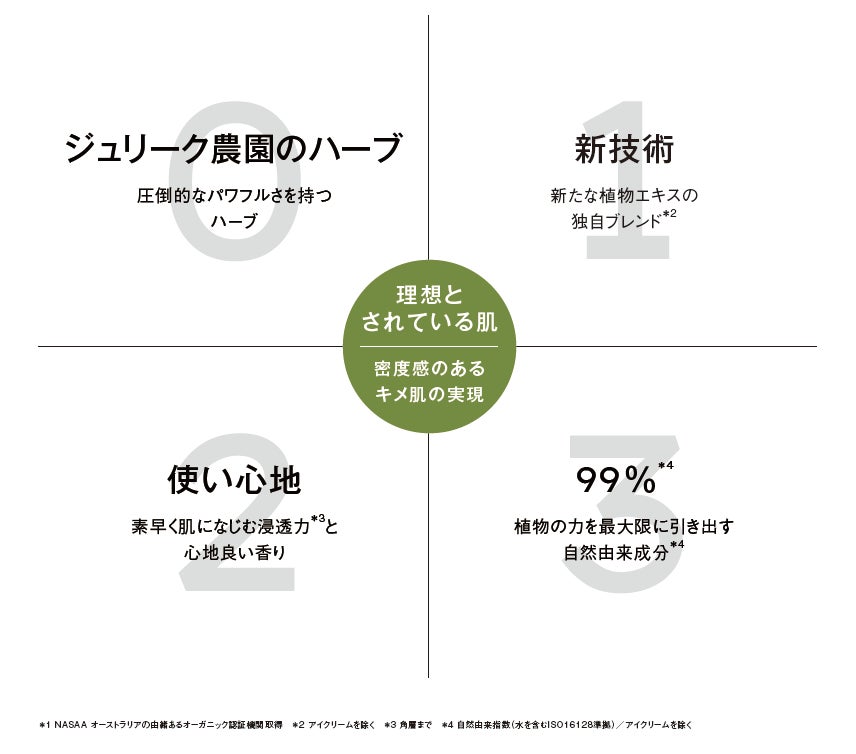 環境により肌のターンオーバーが乱れ、肌本来のキメは失われていきます。ジュリークはキメの失われた肌の不均一さ(線維芽細胞エネルギー低下)に着目。ジュリーク農園で大切に育み、厳選された4種類の植物で構成した「D-BLEND」を開発し、キメの失われた肌へアプローチします。