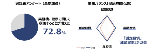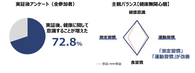 実証後アンケートより72.8%が「実証前と比べて健康に関して意識することが増えた」と回答しており、参加者の健康意識の変化が確認できました。「健康意識」「運動習慣」「食習慣」「測定習慣」に関する項目を点数化した主観バランスの変化をみると、特に健康無関心層が健康関心層と比べて数値の改善がみられました。