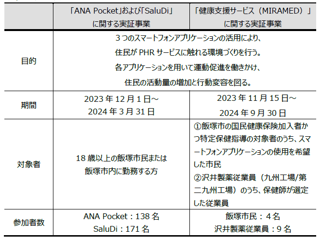 福岡県飯塚市(市長:武井 政一/以下、飯塚市)とANA X株式会社(代表取締役社長:神田 真也、本社:東京都中央区/以下、ANA X)、株式会社インテグリティ・ヘルスケア(代表取締役会長:武藤 真祐、代表取締役社長:園田 愛、本社:東京都中央区/以下、インテグリティ・ヘルスケア)、沢井製薬株式会社(代表取締役社長:木村 元彦、本社:大阪市淀川区/以下、沢井製薬)、株式会社日立システムズ(代表取締役 取締役社長:柴原 節男、本社:東京都品川区/以下、日立システムズ)の日本ウェルビーイングコンソーシアムの4社は、飯塚市で実施した「PHRサービスを起点とした業種間連携型の健康なまちづくり形成に関する実証事業」の結果を公表します。