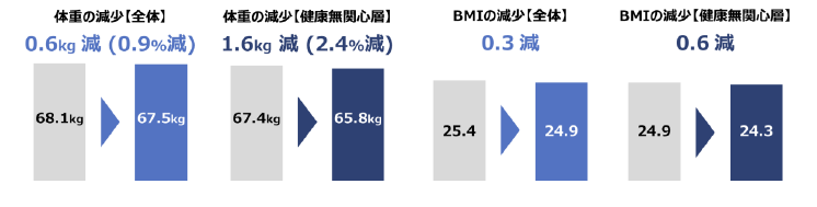 2024年1月~3月の参加者全体の平均体重は0.6㎏減、BMIは0.3減、健康無関心層においては平均体重1.6㎏減(体重2.4%減*4)、BMI0.6減とより有意な体重減少が確認できました。