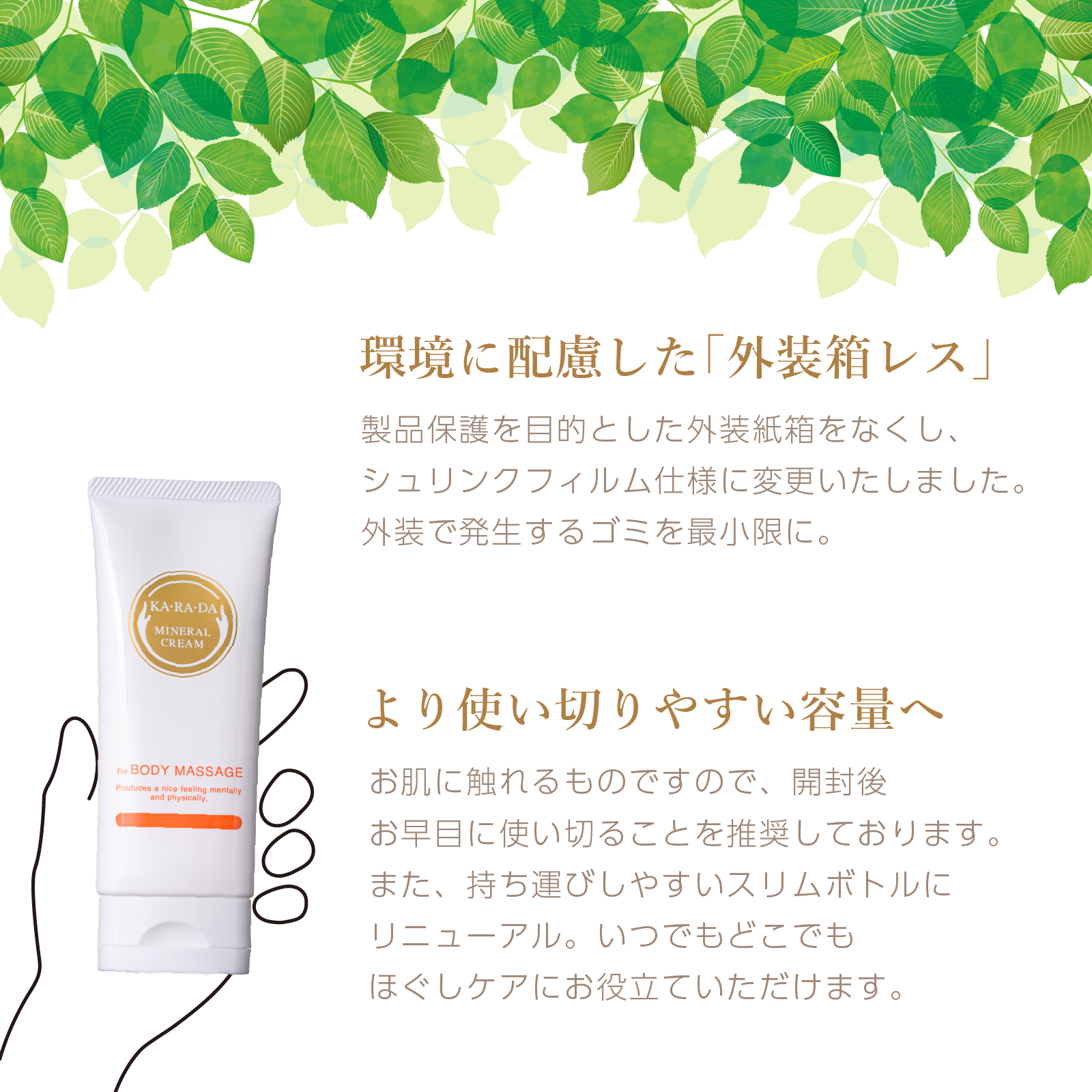 ファクトリージャパンが運営する整体サロンでの施術でも使用しているマッサージクリーム「KA・RA・DAミネラルクリーム」。整体師こだわりのテクスチャーとカラダ想いの成分を配合したオリジナル商品です。気になったその時に塗るだけほぐしデイリーケアが出来るため、ご家庭でも使用しやすいとご好評をいただいており、この度より使いやすく、より環境に配慮した仕様へリニューアル。スリムボトルに変更し、7月より定期便コースをスタート。ネコポスにて配送いたします。