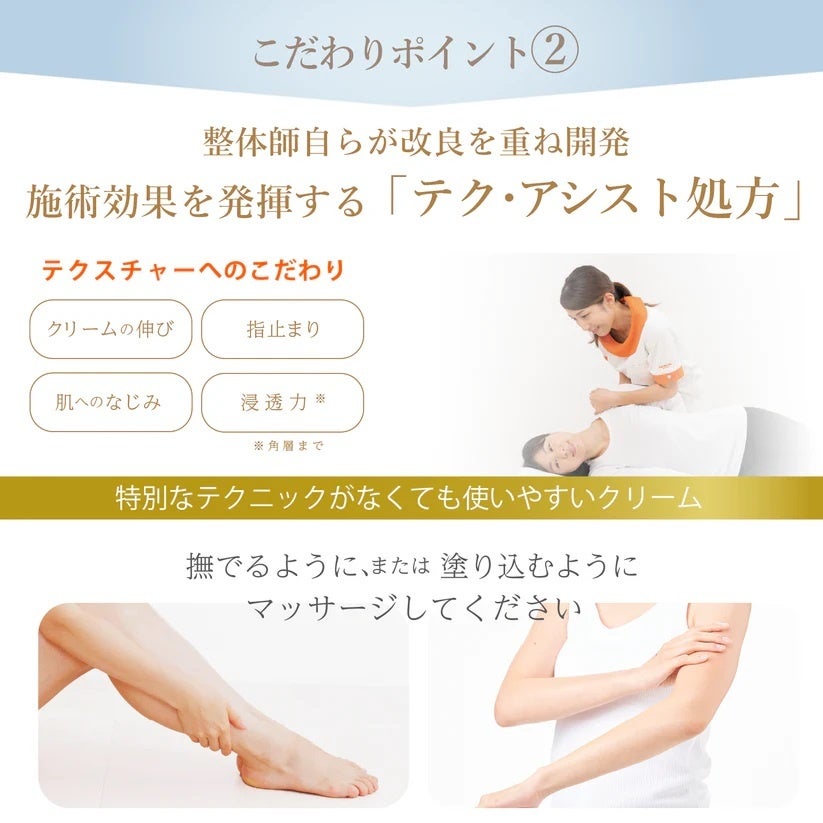 クリームの伸び、指止まり、肌へのなじみ、浸透力(角質層まで)等マッサージ時のパフォーマンスを最大限に発揮するテクスチャーにもこだわっています。ご家庭においても、なでるように塗るだけで、プロの技をご実感いただけるはず。