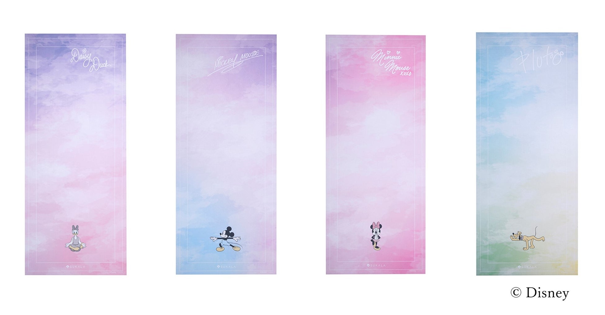 本アイテムは、ミッキーマウス・ミニーマウス・デイジーダック・プルートの4種類展開です。各キャラクターのカラーに合わせた幻想的なグラデーションカラーが基調となっており、ヨガを楽しむキャラクターたちが描かれております。ミッキーマウス、ミニーマウスなどのディズニーキャラクターたちと一緒にヨガをお楽しみいただけるオリジナル商品となっております。
