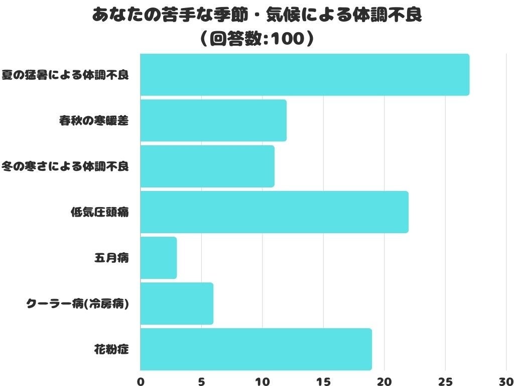 苦手な季節・気候による体調不良をアンケートにて調査したところ、1位は「夏の猛暑による体調不良」でした。
