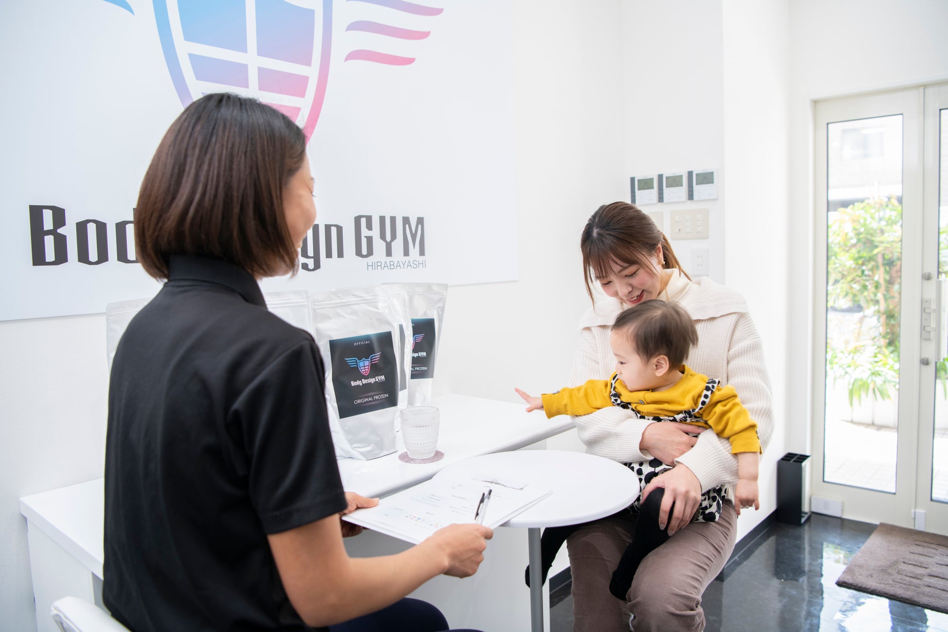 ベビーサークル常備、無料でベビーサークル/保育士資格者の派遣ができるので安心してママもパパもトレーニングが行えます。