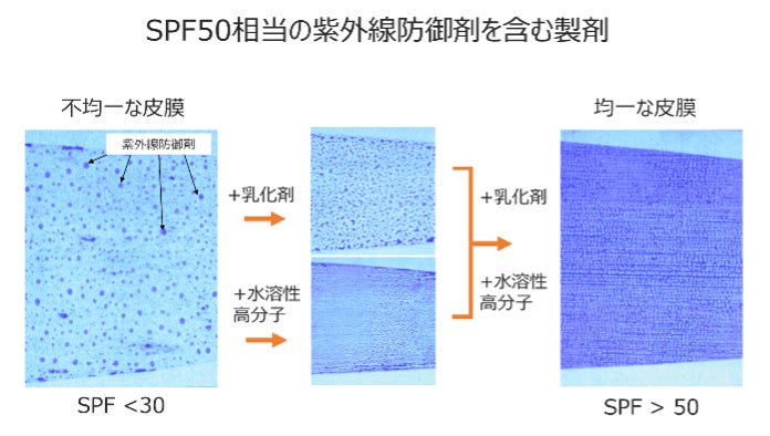 図1:SPF50相当の紫外線防御剤を含む製剤でも不均一な皮膜(左図)では紫外線防御剤が塊になって分散しており、SPFを測定しても30以下の効果しか得られません。この製剤に乳化剤や水溶性高分子を加えると、紫外線防御剤の分散性は向上しますが、まだ不均一です(中央の図)。そこで、乳化剤と水溶性高分子を混合して加え、均一な皮膜が形成されるような製剤を開発し、SPF 測定を行うと、SPFは50を超えることがわかりました(右図)。