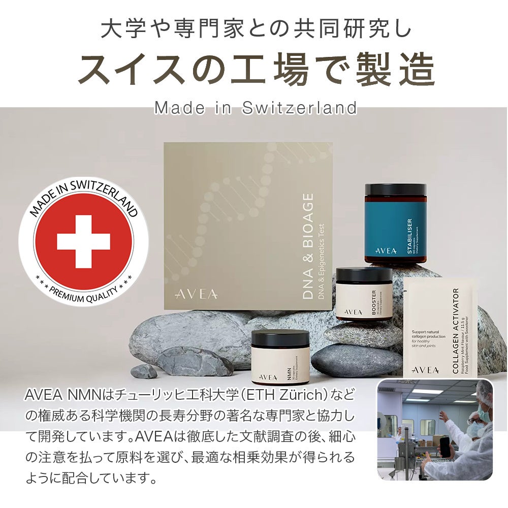 アベアは、品質、革新性、科学的卓越性へのコミットメントにより、すべての製品が最高基準を満たしています。スイスで開発され、厳格なテストに裏打ちされたアベアのサプリメントは、日本のお客様に比類ない品質と効能をお届けします。