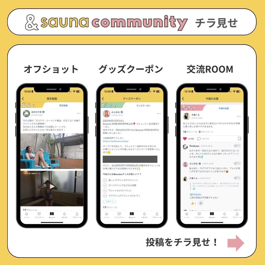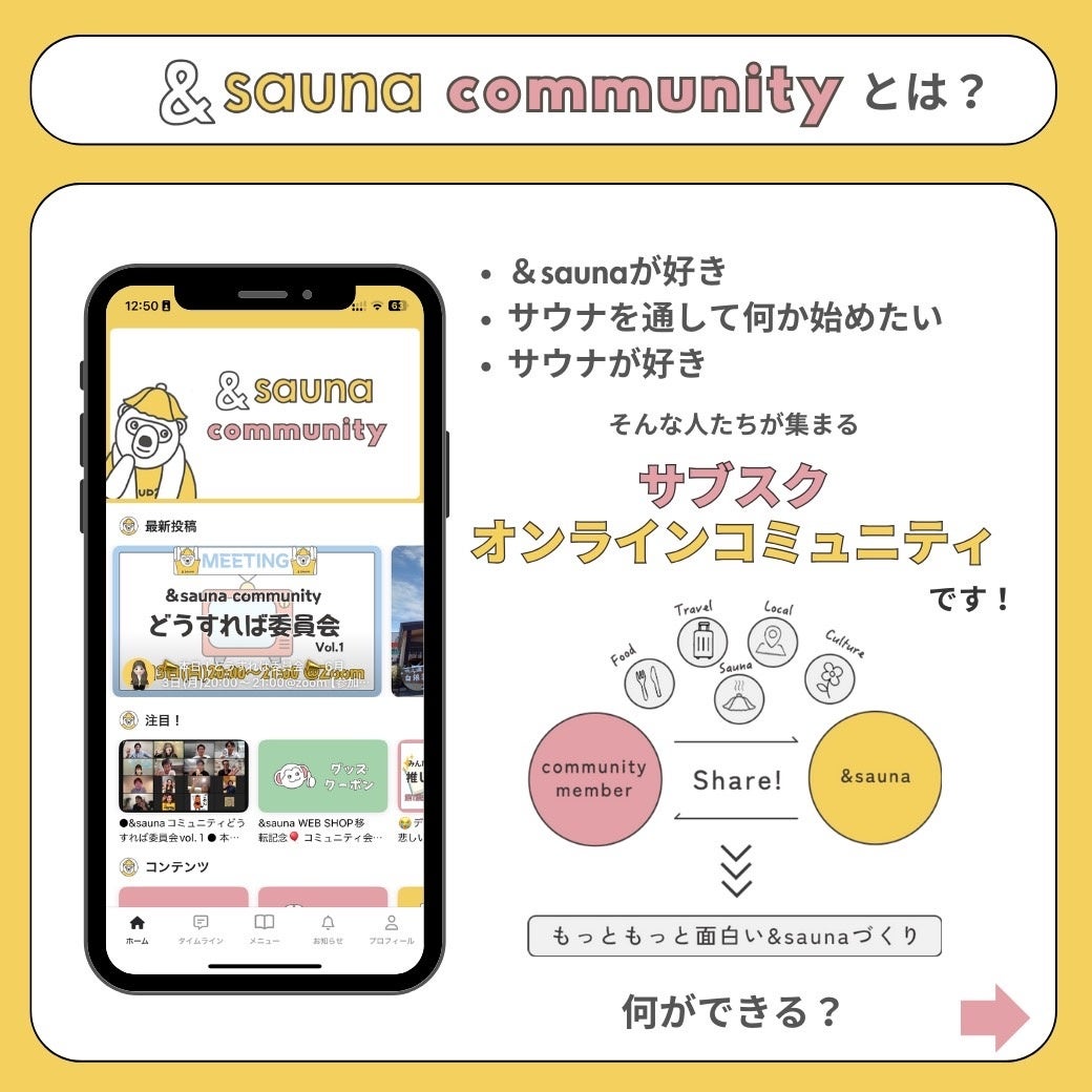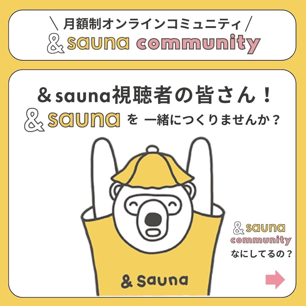 『サウナとその先に広がるカルチャーを探す』をコンセプトに全国各地のサウナ施設を紹介するYouTubeチャンネル「&sauna」。&saunaコミュニティでは、サウナ施設の割引クーポン、ファン同士で交流ができる掲示板やオフ会、限定アイテムや動画の提供、共同プロジェクトの発足など、ファンと共に作り上げる様々なコンテンツをご提供いたします。