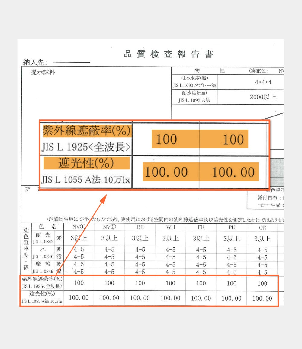 遮光率100%、紫外線(UV)カット率100%、耐水度2,000mm以上の完全遮光生地を使用