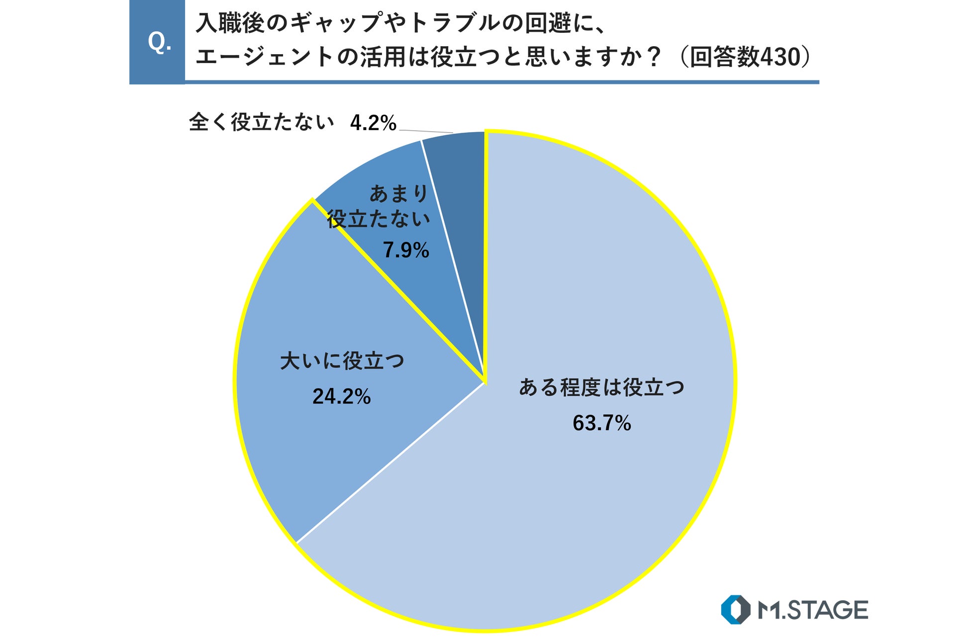 入社後のギャップやトラブルを回避するためにエージェントを活用することについて、「ある程度は役立つ」と回答した医師は63.7%、「大いに役立つ」と回答した医師は24.2%となり、87.9%の医師が入職後のギャップ回避にエージェントの活用が役立つと感じている結果となりました。