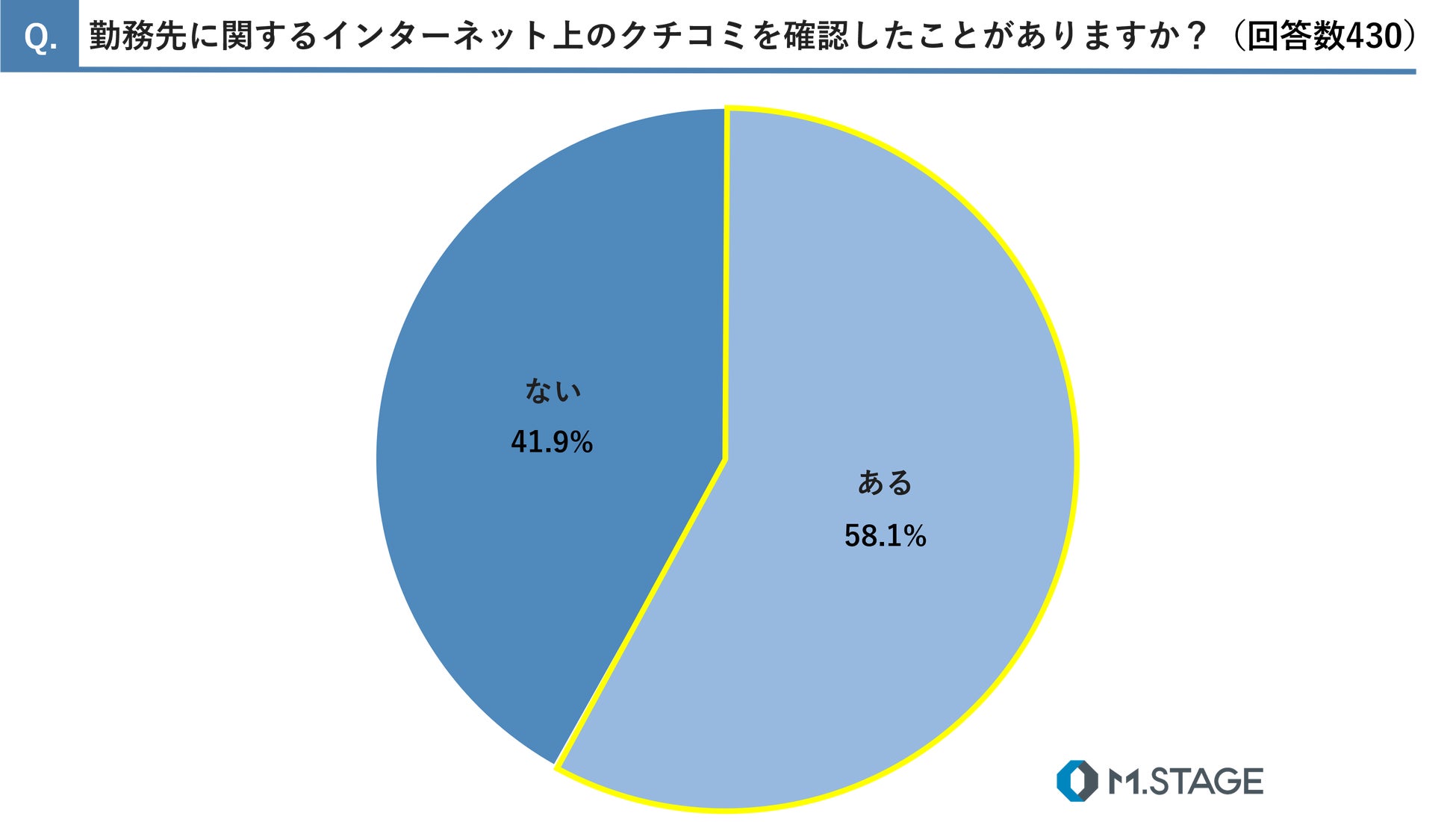 勤務先に関するインターネット上のクチコミ(患者からのクチコミ)について、確認したことが「ある」と回答した医師は58.1%となり、半数以上が勤務先のクチコミを確認したことがある結果となりました。