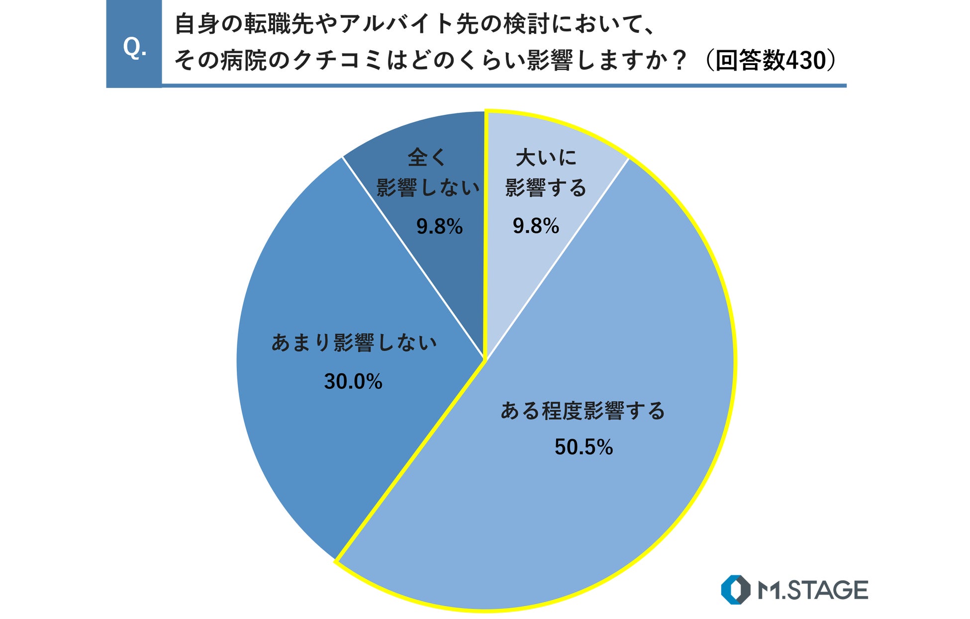 転職先やアルバイト先を検討する際のインターネット上のクチコミ(患者からのクチコミ・転職サイト等の従業員のクチコミ)の影響度合いについて、「大いに影響する」と回答した医師は9.8%、「ある程度影響する」と回答した医師は50.5%となり、約6割が転職先やアルバイト先の検討において、クチコミが影響する結果となりました。