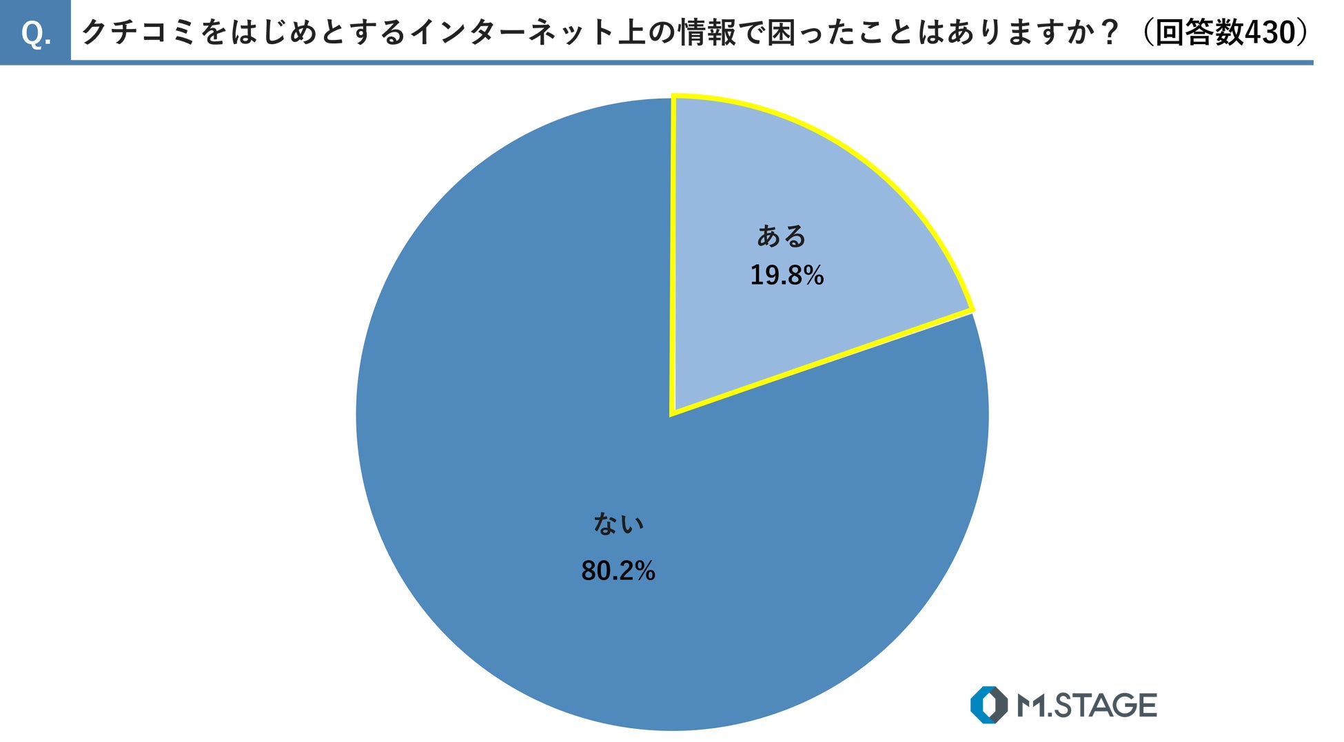 クチコミをはじめとするインターネット上の情報で困った経験が「ある」と回答した医師は19.8%となり、5人に1人の医師はインターネット上の情報によって困った経験がある結果となりました。