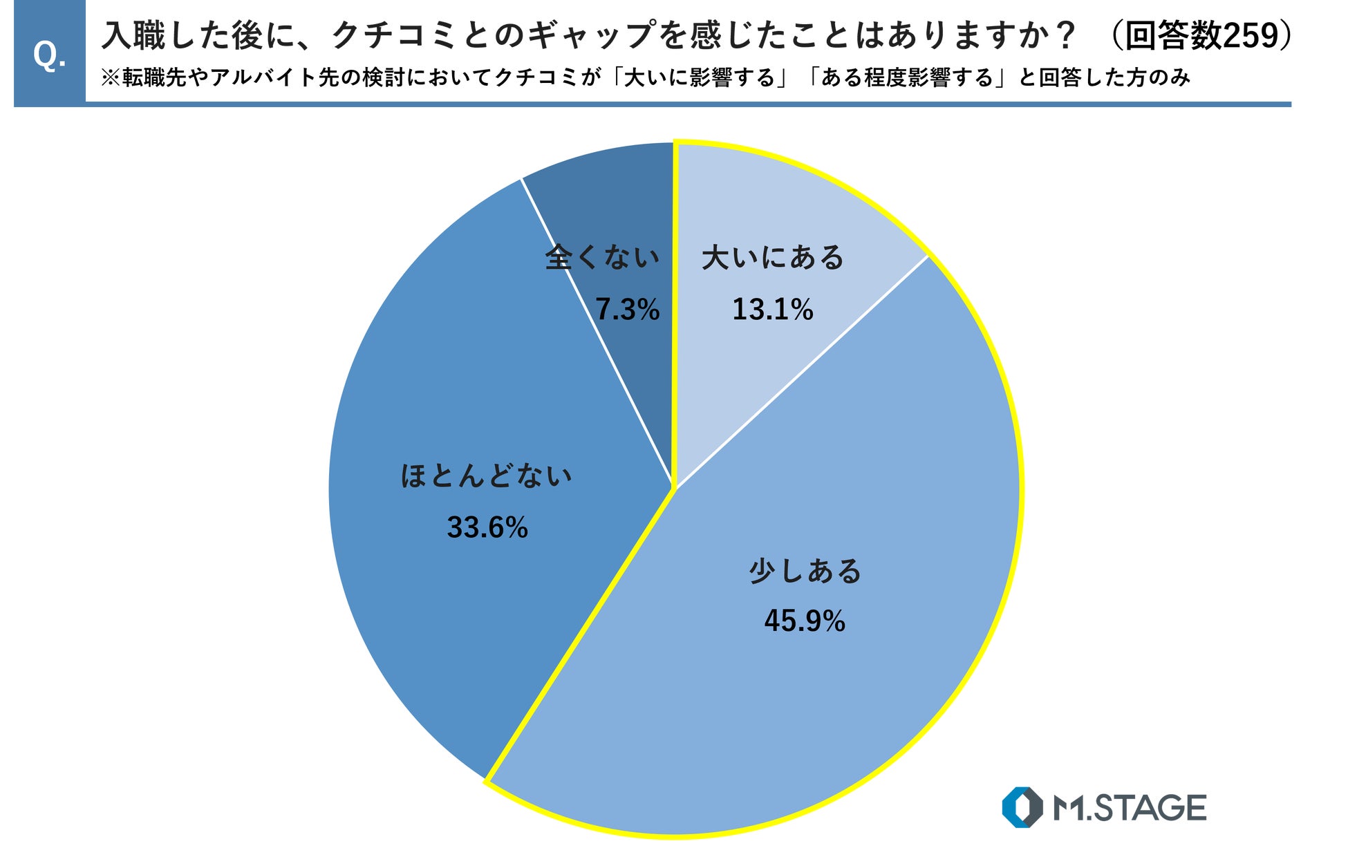 転職先やアルバイト先の検討にクチコミが影響すると回答した医師において、入職後にクチコミとのギャップを感じたことが「大いにある」と回答した医師は13.1%、「少しある」と回答した医師は45.9%となり、半数以上が入社後にクチコミとのギャップを感じたことがある結果となりました。